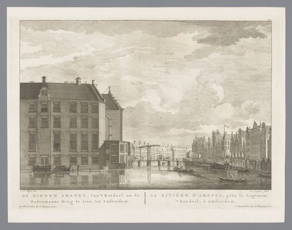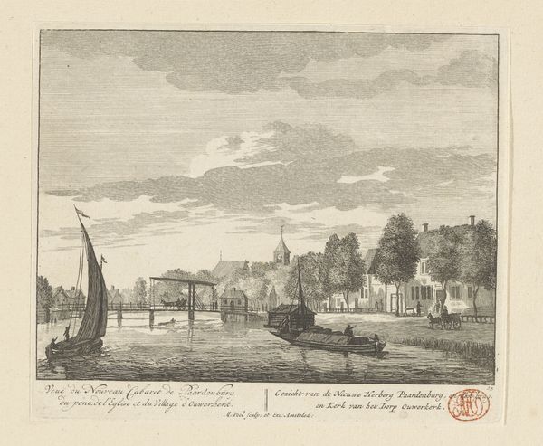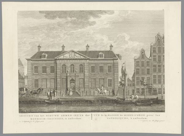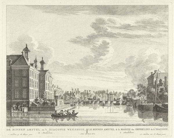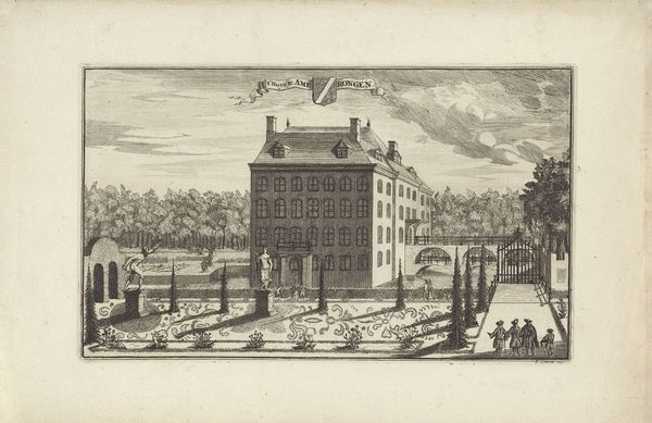 Editor: This is "Gezicht op de vijver van de buitenplaats Driemond" from 1790 by Daniël Stopendaal, currently held at the Rijksmuseum. It's an etching, and the detail is remarkable. I'm immediately struck by how formal and orderly everything is. What do you see in this piece? Curator: It is fascinating to consider how structures, especially those representing power, become encoded within our cultural memory through imagery. Notice how the artist renders the house almost like a fortress, with high walls and carefully positioned figures. Does this visual language convey something about control, or perhaps the anxieties of the time? What emotional effect do the ducks, gliding serenely on the water, have in relation to that? Editor: That’s a really interesting point about the fortress. The ducks do offer some tranquility against the rather stark architecture. Are there specific symbols or iconographic choices that point to a broader cultural context? Curator: Absolutely. Consider the emphasis on perspective and order. In the late 18th century, the Enlightenment ideals were in full swing. There's a visual striving for rationality, mirroring the philosophical and societal shifts that valued order and reason. Even the way the clouds are rendered suggests a sort of… contained drama, wouldn’t you say? Editor: Yes, that's a great way to put it, “contained drama.” I see the composition reinforcing that point. Curator: So, reflecting on what you’ve observed and what we’ve discussed, how do you think viewers from Stopendaal’s time might have interpreted this scene versus how we perceive it today? Editor: I think the sense of order might have been reassuring back then, while today, we might find the formality a little…imposing. This was incredibly helpful! Thanks. Curator: My pleasure. It is always worthwhile exploring how symbolic structures are not only seen, but felt.