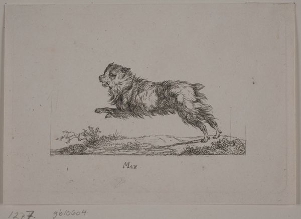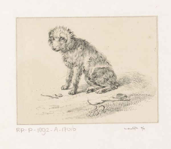 Curator: This understated work, found here at the Rijksmuseum, is entitled "Zittende hond," or "Sitting Dog." It’s an ink drawing by Anthonie van den Bos, created sometime between 1778 and 1838. Editor: It's quite delicate, isn't it? The fine lines create a sense of softness, almost like you could reach out and feel the dog's fur. There's a contemplative, even melancholy mood to it, too, captured perfectly through the downward gaze. Curator: I think what strikes me is the skill involved in rendering texture and form using solely line work. We can also appreciate the production processes. Van den Bos was probably making images of these dogs for prints intended for mass dissemination to wide audiences, even children learning their alphabet. The image becomes both a study in realism but a component of nascent industrial techniques. Editor: Yes, that attention to form is central, isn't it? The circle enclosing the subject isolates the animal, drawing all the focus to the internal construction of lines, contrasts in shading from one section of the dog's coat to another, the acute angles of the seated pose. It is contained and very much about how that form exists within a pre-determined and emphasized formal space. Curator: But there's also the social aspect to consider, the burgeoning role of pets. This realism may be more aligned to middle-class desire for detailed observation. How this imagery became a commercial component to daily life. Editor: Agreed! I would simply say that, by so carefully representing the dog, by isolating it so specifically through the structure of lines within a carefully arranged frame, the work makes the case for seeing. We begin to observe the specific details and therefore observe life outside of us in greater detail. It trains our eye. Curator: Interesting… it forces one to acknowledge the convergence of commerce and domestic portraiture and that liminality, too. I now have a much deeper sense of the production around such artwork. Editor: Absolutely! Paying attention to line, tone, and structure makes a piece speak.
