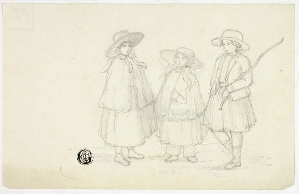 Friedrich Maximilian Hessemer created this drawing, titled 'Three Children', currently held in the Städel Museum. The composition is immediately striking for its simplicity and directness. Three figures are rendered in delicate lines against a muted background, each standing rigidly. The arrangement is symmetrical and balanced, with a single figure in the center and two flanking it. The texture of the drawing is smooth and unvaried, emphasizing the linear quality of the work. The children are depicted in period clothing, which serves as signs of cultural identity. There is a clear effort to portray the figures accurately and objectively. The lack of expressive lines or dramatic shading suggests a focus on form and structure rather than emotional depth. Hessemer seems interested in the semiotic potential of clothing, a system of signs. He presents the figures not as individuals but as representations of their social roles. Ultimately, the drawing engages with broader cultural and philosophical discourses around representation, identity, and the relationship between the individual and society. Hessemer's structured approach invites us to consider how visual elements can convey meaning.