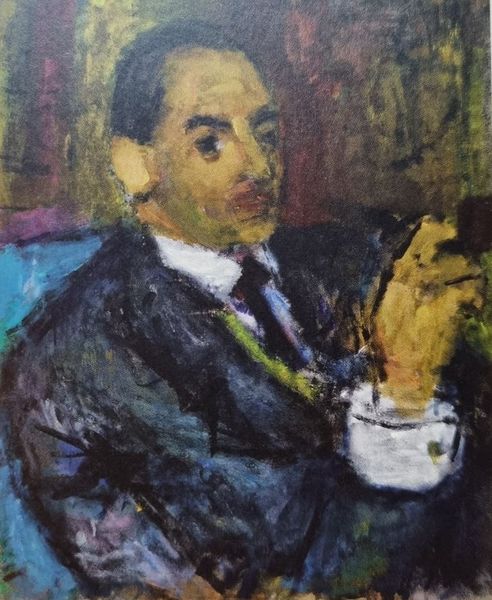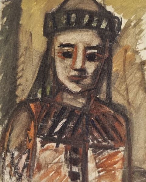 Editor: So, here we have "Czóbel Béla Kalapos Fiú," an oil painting by Béla Czóbel. There's a certain raw, almost childlike quality to the brushstrokes, and I'm intrigued by the way the figure's eyes seem both innocent and knowing. What strikes you most when you look at this piece? Curator: Well, immediately, I'm drawn to the hat itself. What does a hat signify? Think of the history embedded in head coverings – status, profession, even rebellion. What kind of statement do you think this “Kalapos Fiú,” or "Boy with Hat" as it translates, might be making, or concealing? It looks almost like a theatrical prop here. Editor: That's interesting, I hadn’t thought about the theatrical aspect. I was more focused on the expressionistic style and the slightly melancholic air. But the hat does add another layer. Curator: Exactly. It almost serves as a mask, doesn't it? An external marker to define a character. What's underneath could be very different. And that backdrop, a flat wash of what color, fiery orange? Editor: Yes, quite intense! It highlights, for me, the tension between vulnerability and a sort of self-aware performance. Curator: Indeed! So we might say this boy presents both an outward performance signified by the hat, yet perhaps the raw color conveys raw truth underneath. And which might be more truthful? Do you suppose the color and brushwork intend to undermine the presumed social function of the hat? Editor: I see what you mean. The symbols are competing, making the image all the more complex. Thanks, that’s a new layer for me. Curator: And for me, considering Czobel's use of color, perhaps the boy in his hat yearns to discard the mask. These artists… they ask so many layered questions.