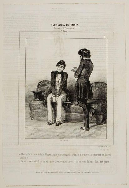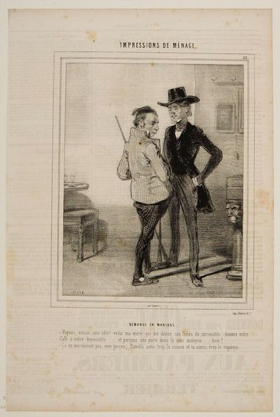 Curator: Paul Gavarni, a 19th-century artist, created this lithograph titled "A Charming Role." It captures a distinct moment, doesn't it? Editor: Indeed! The contrast between the seated figure and the standing woman creates a powerful tension within the otherwise simple composition. Curator: It speaks volumes about gender roles in the 19th century, doesn’t it? The woman, possibly in costume, her back turned, almost defiant, while the man sits passively, holding a cane like a prop. Editor: Yes, the line work accentuates form, almost exaggerating the costuming. And yet there's something undeniably captivating about it. Curator: It invites us to consider the expectations placed on women and the performance of identity within a specific social context. Editor: I agree, and it’s precisely the interplay of these visual elements that creates such a compelling dynamic. Curator: It's a work that resonates even today. Editor: A fascinating study.