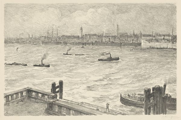 Editor: Here we have "Haven te Hamburg," or "Port of Hamburg," an etching by Carel Nicolaas Storm van 's-Gravesande, created sometime between 1851 and 1902. It gives such a strong impression of a bustling, busy port. All those masts! What stories do you see in this piece? Curator: The masts are fascinating, aren't they? Rising like skeletal trees. Consider them, not just as structural elements of ships, but as symbols. Masts are connection, literally a link to faraway lands, dreams, commerce. Notice how the artist uses the etching technique; those delicate lines create an incredible sense of depth and atmosphere, almost as if we can smell the salt air. Editor: That’s a beautiful point – those skeletal trees – that sense of both potential and… something almost forlorn. Do you see any kind of contrast between the boats, the modes of transportation? Curator: Precisely. We have these sailing ships and the emerging steam-powered vessels. Sailing ships representing the older order are gradually overtaken, in numbers, by those emitting smoke from newly-constructed smokestacks along the distant docks. Doesn't that image carry with it the weight of societal change and industrial advancement? Editor: It’s striking how potent those relatively simple shapes become, seen that way. Thanks – I wouldn’t have picked up on that so readily myself! Curator: Indeed. What we see represented are objects laden with memories, reflecting our relationship with both progress and the past. It’s remarkable.