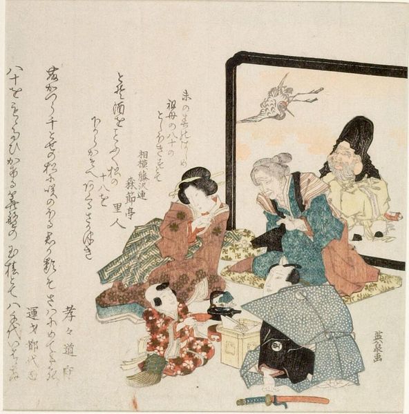 Curator: This is Utagawa Kunisada's print featuring actors Iwai Kumesaburō and Onoe Kikugorō in a Soga Brothers play. The actors, depicted mid-performance, seem to embody intense emotion, wouldn’t you agree? Editor: Yes, definitely! The dynamic poses and dramatic expressions create a sense of heightened tension. What do you see in this piece beyond the immediate drama? Curator: I see a commentary on the rigid social structures of the Edo period and how kabuki theater offered a space to subvert those norms. Consider the actors themselves – portraying characters outside their own lived realities, challenging expectations. The use of text also provides a critical lens, offering layers of meaning beyond the visual narrative. Editor: So, the print is more than just a depiction of a play; it's a reflection on societal roles and performance? Curator: Precisely. It invites us to question the boundaries between performance and identity, and how art can become a site for social commentary. Editor: That's fascinating. I initially saw just the drama of the performance, but now I see the underlying social critique. Thanks for sharing that insight.