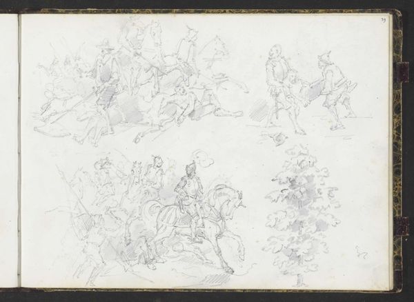 This graphite drawing, "Studieblad met liefdesparen en een familiegroep" by Lambertus Lingeman, presents an intimate glimpse into 19th-century life, with its studies of love, family, and leisure rendered in delicate, yet confident lines. The composition, a patchwork of vignettes, invites us to consider each scene as part of a larger narrative about human connection. Lingeman's technique reveals a fascination with the subtle play of light and shadow, achieved through a careful modulation of tone and texture. Note how the cross-hatching and delicate strokes build form and volume, creating a sense of depth on the flat surface. The sketch-like quality of the drawing allows us to see the artist's process, his exploration of form and movement, and his interest in capturing the fleeting moments of everyday life. This approach can be seen as a reflection of the broader artistic and philosophical concerns of the time.
