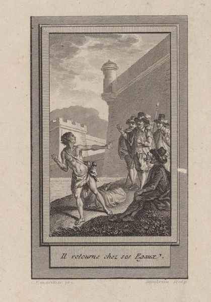 Curator: The artwork before us is an engraving from around 1790 by Louis Michel Halbou, titled "Man standing before a woman in curass seated on a cannon." Editor: It's intriguing. There's a curious contrast in textures and form between the woman's smooth, flowing armour and the jagged lines of the man's coat and breeches, set against what looks like a rather meticulously drawn backdrop of sky. Curator: Yes, it’s interesting how Halbou is using this moment to depict shifts in power. The female figure, sitting atop a cannon in her war regalia, represents authority, literally enthroned by military strength, as the male figure extends a hand in what appears to be subservience or supplication. Editor: From a strictly formal viewpoint, note how the diagonals of the cannon, flag and wall all serve to frame the characters, focusing our attention to their interactions. Also note that her body mimics a cannon with that diagonal angle as well. Curator: Contextually, prints like these often circulated to disseminate political messages and create commentary on societal norms. Was this artwork advocating for shifting roles, maybe even with a bit of irony embedded? It's difficult to say. But we can assume, even looking at clothing of both individuals and objects surrounding them, that it's likely commenting on class. The cannon, being a device created for use for class and dominance, she appears calm while sitting above it. The male figure offers respect by not holding arms of any kind and showing he has no potential conflict. Editor: You’re absolutely right about the context adding weight. Without that lens, I see a compelling composition with sharply rendered figures occupying a stark, emotionally ambiguous space. I keep being drawn to the contrast between light and dark—notice the shadow cast onto the building on the left? It seems to indicate the darkness he might be leading to. Curator: So much is left for us to question when encountering such prints. It makes appreciating the print that much more impactful to remember that it serves not only to preserve that time period, but the class struggles that can last through many periods in time. Editor: Absolutely, it demonstrates how meticulous attention to detail can unlock deeper social narratives.
