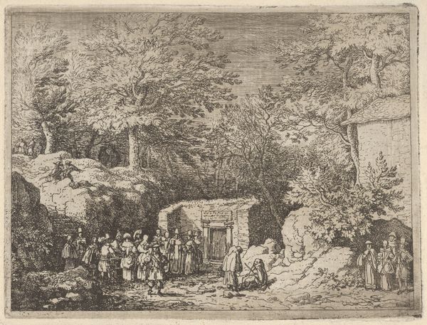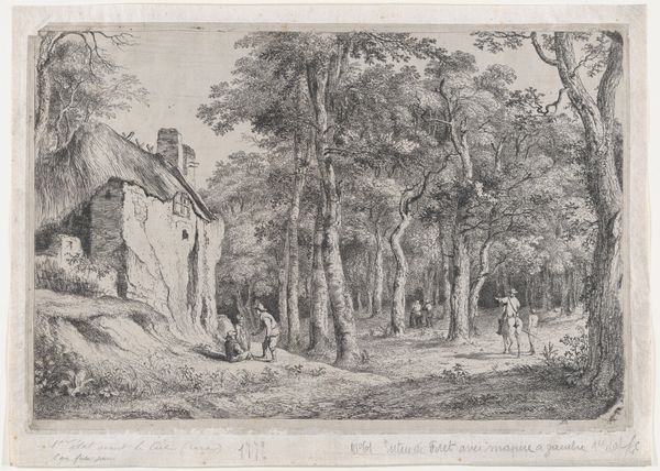 Carl Wilhelm Kolbe created this black and white etching titled 'Straw-Thatched Hut with Landscape and Figures,' sometime between the late 18th and early 19th centuries. Kolbe lived during a period of significant social upheaval and transformation in Europe. This artwork embodies the Romantic movement's fascination with nature and the idealized simplicity of rural life. However, this idealized view often glossed over the realities of poverty and hardship faced by many rural communities. The figures in the foreground, perhaps a family, suggest a narrative. Their interaction invites speculation about their relationships, their daily lives, and the challenges they might face. Are they farm laborers, or simply travelers passing through? Kolbe's emphasis on the picturesque and idyllic invites us to consider how we often selectively frame our understanding of history, choosing to focus on beauty while overlooking the complexities and inequalities that exist beneath the surface. It reminds us that even in the most beautiful settings, the realities of human existence are always present.