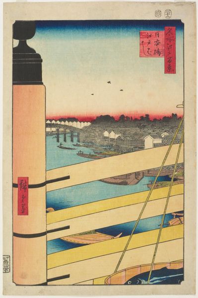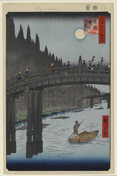 Curator: Utagawa Hiroshige’s "Evening Shower over Ōhashi Bridge and Atake," likely created between 1857 and 1859, immediately evokes a distinct atmosphere. Editor: It does—a mood of almost melancholic beauty. The way the rain is depicted, those forceful vertical lines, lends the whole scene a weight and solemnity. Curator: Precisely. Note how the artist uses the falling rain not only to create this mood, but also to visually structure the composition. The verticality of the rain contrasts elegantly with the horizontal emphasis of the bridge. Editor: The bridge construction itself is fascinating, the way those supports plunge into the water. One imagines the labour involved in its creation, the community dependent on its use and durability. Those deep, repeating diagonal patterns are quite mesmerizing to examine and provide much needed visual grounding to contrast the heavy vertical rains. Curator: Certainly. The woodblock printing technique, allowing for such intricate lines and patterns, demonstrates a masterful control over form. The arrangement also creates depth; figures on the bridge are foregrounded against the suggestion of the distant shore in the background. Editor: The sheer amount of manual labor required is implied but, looking closer, do we really understand what quality of lumber the woodblocks are made of, and its influence on the final print outcome? What was the nature of labor here: Guild or something less regulated? Curator: It’s a worthy consideration. What strikes me still is the reduction to simple geometric forms, the formal arrangement that moves from distinct shapes into suggestions of the human element under the weather. Editor: So while we contemplate the artist’s technique and compositional strategies, let’s consider the tangible resources. Labor, raw materials…these bring a critical perspective. Curator: Ultimately, I am struck by the elegance, even in such a somber scene. Editor: Indeed, contemplating its production adds to my appreciation.
