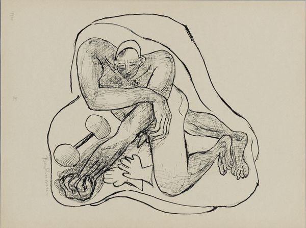 Curator: Here we have Richard Nicolaüs Roland Holst's 1914 pencil drawing, Christophorus. Editor: It's haunting, isn't it? I feel like I've stumbled upon a fever dream. The tenderness is offset by an undeniable tension. It's like watching someone carry not just a child, but the weight of the world. Curator: Roland Holst, though associated with socialism, often incorporated religious and mythological figures into his art. This drawing depicts Saint Christopher carrying the Christ Child across a river, a popular subject symbolizing protection and safe passage. It seems the artist did also works using religious, romantic, and surrealistic lenses. Editor: Protection…that's interesting, considering the almost spectral quality of the figures. The delicate pencil strokes and soft washes give them an ethereal feeling, like they might dissolve at any moment. I notice a sense of unease. And look at the lines, how he's crafted a sense of otherworldly embrace with waves, and almost botanical shapes? Curator: The wave-like elements definitely amplify the theme of passage and movement. Remember, St. Christopher is the patron saint of travelers. This was also a time of immense social change, right before the First World War. You can feel in a way that the war and his sympathy towards socialism are already present. Maybe the drawing speaks to the yearning for guidance and security amid chaos and uncertainty. Editor: Maybe, and it's such an odd perspective. It's round shape feels like looking into a locket. To me the waves make me think more of the interior world rather than the outside; like a stormy mind trying to overcome turmoil. It reminds me of when my child would hold onto me for dear life. Curator: Art is rarely straightforward, right? This drawing presents us with an icon transformed, steeped in pre-war anxieties. Roland Holst reframes St. Christopher's strength as burdened and somewhat weary, fitting his moment and artistic background. Editor: It's a beautiful meditation on burden and faith, even without knowing the religious context. Thanks to your information about the historical elements I realize the intention of this peace might not be as surreal as I thought at the start. But more personal, that might have meant more back then than anything. Curator: Exactly! It highlights how artists can borrow from religion to show political contexts in different styles such as Romanticism, which allows him to introduce his political point in different manner. Editor: A perfect bridge between the historical and the deeply personal, right? Well, this journey, heavy as it looks, makes one ponder.