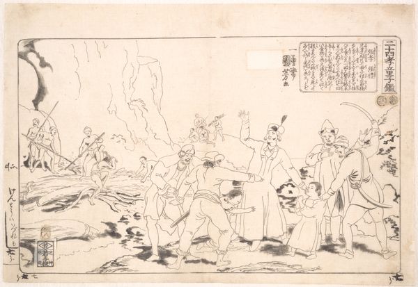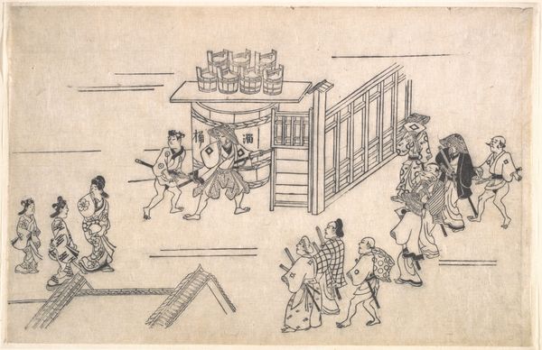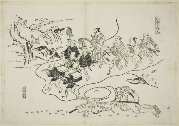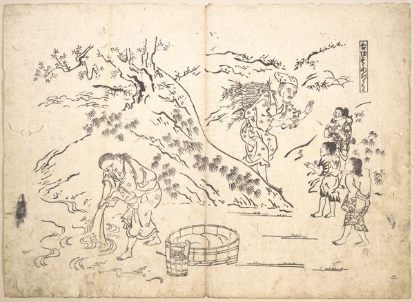 Okumura Masanobu created this ink on paper woodblock print titled "Woman Pursuing Sparrow" sometime in the first half of the 18th century. It’s a scene of everyday life, but look closer, and you see it tells us much more about the artist's society. The image presents us with a glimpse into the social conditions of Japan's Edo period. This was a time when woodblock prints were becoming increasingly popular, as they were relatively inexpensive and could be produced quickly. Masanobu was one of the key figures in this boom. The print shows ordinary people going about their daily routines in a rural setting. The woman chasing the sparrow, the men carrying goods, and the children playing – all of these details paint a picture of the social life and economic activities of the time. The imagery in the artwork isn’t merely a snapshot of reality; it comments on the social structures of the time, with all its nuances and complexities. To fully understand this artwork, we can turn to historical records, literature, and other cultural artifacts from the Edo period.