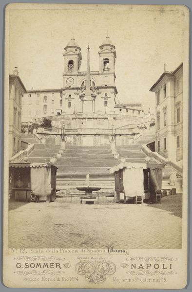 Editor: Here we have an undated print, sometime between 1865 and 1900, titled "Klokkentoren van de kathedraal van Ferrara," attributed to Fotografia dell'Emilia. It’s a gelatin silver print and, wow, the sheer scale of the bell tower against the market stalls creates such a striking contrast. How do you interpret this image, considering its historical context? Curator: The tension between the timeless architecture of the bell tower, a symbol of civic and religious power, and the bustling temporary market at its base is precisely where the photograph finds its power. Consider the role photography played in the late 19th century. It was used both to document urban development and to shape perceptions of cities like Ferrara. Editor: That makes sense. It's like a record of a moment, but also an advertisement of sorts for the city, perhaps? Curator: Exactly. Notice the figures in the foreground; their presence anchors the photograph in everyday life, making the grandeur of the tower more accessible. But who was the intended audience for this photograph? Was it aimed at locals to instill civic pride, or tourists to promote Ferrara as a cultural destination? Or both? Editor: So, it's not just a picture of a pretty building, it’s also a reflection of social dynamics and intended purpose. What is striking to me is the contrast in permanence, what has stood and what is fleeting. Curator: Yes, and by framing this specific contrast, the photographer makes an argument about Ferrara's place in time and perhaps, the enduring power of institutions versus the transience of daily life. What else did you notice? Editor: I guess the presence of so many figures, who were standing around when the image was taken, humanizes what otherwise might have felt sterile. It definitely lends to its "slice of life" feeling. Curator: Absolutely. Photography’s claim to objectivity often obscured its inherent biases. By considering these nuances, we move beyond merely admiring the visual spectacle to understanding its complex social and political implications. Editor: I never thought about a simple photograph having so many layers. Thanks for your help! Curator: My pleasure! It's all about looking critically, considering who made the image and why. Every photograph tells a story.