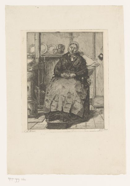 Curator: The quiet hum of history whispers from this engraving, doesn't it? The piece is titled "Goudweger," or "Gold Weigher," and was completed sometime between 1864 and 1909 by Jean-Baptiste Anthony. I find the artist's close attention to detail just mesmerizing. Editor: Mesmerizing indeed. There's a starkness to it, though. Almost a somber stillness. The detail is fascinating, especially around his face and beard, but I find myself a bit saddened by the stark blacks and whites...like a memory fading at the edges. Curator: It's the Renaissance aesthetic, for sure. Gold, scales, closed boxes…all images relating to balance, materialism. The man himself with his tools, perhaps signifying a symbolic weight, both literally of the gold, but perhaps spiritually as well? Editor: Yes, exactly! The act of weighing itself becomes a symbol! Think about the scales of justice or even the act of measuring worth—human or otherwise. The objects hint at earthly gains, but also…at the consequences of earthly focus. That box on the floor, for example, I feel it speaks of temptation or sin, the weight of choices, perhaps? And the placement—we look down on it with him—feels very intentional. Curator: Precisely. These visual motifs create layers, deepening the artwork’s narrative beyond a mere portrayal of a historical figure, what I might describe as Genre Painting, or perhaps a subtle twist of historical narrative within portraiture. One cannot know for sure but that the artist was interested in these multiple dimensions of meaning-making. Editor: And this all works in concert with the overall feel. He’s caught in a pool of quiet, meticulous action... I am caught by his complete focus. His world is narrowed to those scales. Curator: What lingers for me is the dedication that went into producing the work. There’s a sensitivity evident, which almost transcends time. Like finding a quiet moment amidst our own relentless march. What do you think? Editor: For me, it is the power of objects to convey emotional weight and memory and the quiet intensity. Perhaps it's a reflection on mortality, a gentle reminder that our time, like gold, is precious and should be weighed with care.