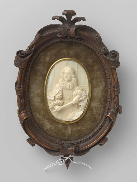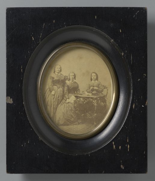 Editor: So, here we have a portrait from 1860, titled "Portret van Johann, Wilhelmine en Julius Ballach"—that's Johann, Wilhelmine, and Julius Ballach—the artist is anonymous, and the piece combines photography with wood carving. It feels so formal and yet intimate, framed in this elaborate, hand-carved surround. What strikes you most about this work? Curator: What jumps out to me is the tension between accessibility and privilege, isn’t it? The relative newness of photography in 1860 democratized portraiture to a degree, allowing a wider segment of the population to document their likeness, particularly with loved ones, within a domestic space. But then we have that elaborate, ornate, hand-carved wooden frame which speaks of considerable resources. Do you think it challenges our traditional understanding of romantic portraiture? Editor: I see what you mean! The frame certainly elevates the image, suggesting status. And I guess portraiture always involved that element of showing status. So does it complicate our perception of who had access to art at the time? Curator: Exactly. This challenges the simple dichotomy of who made art and who consumed it. In what ways does this portrait complicate our perception of family identity in the Victorian era? The formality, yet obvious emotional ties, create a fascinating intersection, don't you agree? Editor: Absolutely! It makes you wonder about the stories and circumstances behind this family’s decision to create such a carefully constructed image of themselves. Curator: Indeed! Considering how this portrait connects to our understanding of the social landscape of the 19th century helps make its meaning feel surprisingly current. Editor: This really opens up new avenues for me to consider in art history. Curator: Wonderful. I’m glad to hear that. Always consider the frame through which you view a piece.