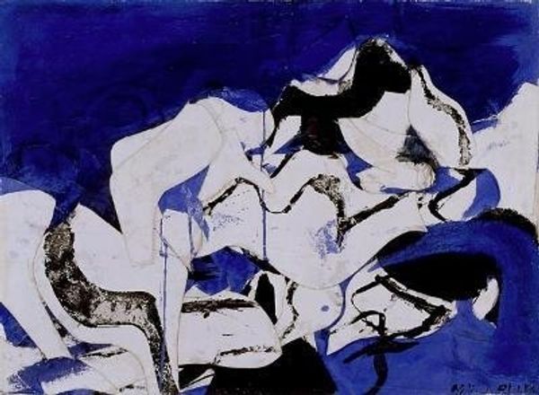 Curator: Here we have David Park's "Reclining Nude," created in 1960, rendered with bold strokes of ink. It strikes me immediately as a departure from conventional reclining nudes we often see in art history. Editor: Yes, a sharp contrast indeed. My initial impression is one of melancholy, or perhaps a heavy weariness. The stark black ink against the cream paper gives it a rawness. The quick strokes convey a certain vulnerability, almost as if the figure is dissolving into the shadows. Curator: Exactly. Park was associated with Abstract Expressionism and later moved to a more representational figuration, retaining that raw emotional intensity. I see symbolic resonances within the pose itself. Consider the abandonment of typical romantic presentations. This is a figure, yes, a body…but perhaps conveying a much greater feeling of existential weight, a moment of quiet contemplation or resignation. Editor: I appreciate how you link the artist’s style with this emotional weight. The shadows dominating much of the frame give it an anxious tone. You’ve got this recumbent nude resting on what looks like a high-backed chair with long, almost oppressive bars, and those shadows feel, in our current context, like they’re commenting on body politics, and the often difficult realities of existing within the public gaze as a woman, particularly. Curator: The symbols become especially pronounced when considered through a contemporary lens. And yet, I think it also resonates more broadly with universal human experiences, a reminder of our own vulnerability. I wonder about the artistic lineage here: hints of Matisse, but distilled down, freed from any pleasant domesticity, infused with this almost frantic energy. Editor: Agreed, it's far from the serene languor of a Matisse odalisque. The figure seems almost trapped by its stark environment and her own exhaustion, perhaps a statement about the burdens and confines imposed upon marginalized bodies. In terms of technique, the immediacy of the ink medium lends urgency. It feels like Park wanted to bypass the conventions of idealized beauty to reveal something deeper, maybe less palatable about our embodied experience. Curator: A potent visual statement about the intersection of body, space, and emotional realities. The absence of detail forces the viewer to engage with a certain gestural expression and a symbolic landscape within. Editor: I agree. There's a call for critical empathy here. We're invited to witness not just a body, but an emotional state tethered to its social reality. Thanks for bringing David Park’s emotional rawness and stylistic intent into greater relief.