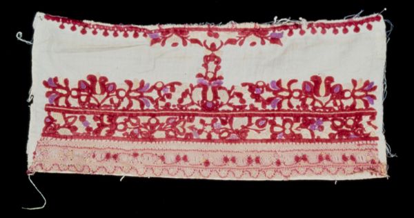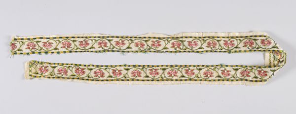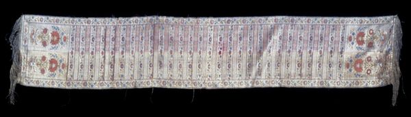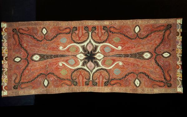 Curator: I’m immediately drawn to the intricate, almost dizzying, patterns of this textile. Editor: This is "Towel Scarf," made sometime in the 19th century by an anonymous artist. It resides here at the Minneapolis Institute of Art. The use of mixed-media on fabric creates such a fascinating textured surface. Curator: Absolutely, the textile speaks to a domestic craft tradition elevated through skillful execution. One sees echoes of the Pattern and Decoration movement even though that’s obviously later. Do you agree? It projects comfort and sophistication simultaneously. It's not merely functional; its artistry suggests a significant place in social rituals or displays. Editor: Definitely. The intense detail points to considerable labor. Looking closely, one wonders about the individual(s) who conceived and executed this, their material conditions, access to dyes and embellishments, and skill passed down through generations. I want to feel its heft. Curator: Good point, and that prompts me to consider who the primary consumer was—its function within a domestic or public sphere, and if its function dictated its design, which blends both abstract and decorative geometric patterns, as you said earlier. The visual language here offers insights into class and taste during the era it was crafted. Editor: Yes, precisely. I think understanding how something like this was produced and circulated reveals a network of dependencies—raw material extraction, trade routes, artisan expertise. What appears merely decorative also functioned within very real social and economic structures. Its materiality is evidence. Curator: That’s a good reminder, seeing art as inextricably linked to social and political realities, that material choices convey coded messages about status and aspirations and identity. Editor: And this reminds me that even mundane objects often carry unseen histories of labor, resource extraction, and artistic expression. Curator: Indeed, there’s much more to explore beneath the surface.