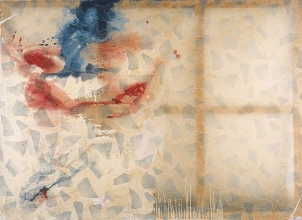 Curator: Oh, what a delightful surprise! Calder's "Pluie en Islande," created in 1965. A playful title, no? Especially juxtaposed with these stark figures below. Editor: My first impression is… melancholy, but whimsical? Like a rainy day parade of silhouettes, the rain falling on paper cutouts dancing beneath. The way those watercolors bleed is both charming and sad. Curator: I find that such a perceptive reading. "Pluie en Islande" showcases how Calder used watercolor to translate his kinetic sculpture's essence onto a two-dimensional plane. The falling lines echo his mobiles, a symphony of controlled drips rather than moving forms. The figures feel very much influenced by some primitive figuration traditions, don't you think? Editor: Absolutely. These dark forms definitely seem less about precise portraiture and more about universal human gestures, like figures in a shadow play, grappling with the elements. And look at the limited color palette: that stormy blue overhead and the warm, rusty-red raindrops! It creates such an expressive dynamic. Does Iceland symbolize something here, I wonder? Curator: That's always the fun part, isn’t it? Contextually, Calder travelled extensively, including Iceland, I'd speculate it may serve as a touchpoint or memory imprint. He observed those spaces from a very keen aesthetic perspective, filtered into abstracted form, imbued with that iconic Calder sense of play. Perhaps it's less about literal Iceland, more about evoking a mood and climate through basic shapes. Editor: It reminds me that even something seemingly chaotic, like a rainstorm, can have rhythm and order, something intentional and man-made even... And those small silhouettes are grounded even by the blue elements "unleashed" by Calder at the very top. Almost a comfort there. Curator: Comfort indeed. Calder often bridged high art with an almost childlike approach, making you believe creativity doesn’t need stuffiness. Editor: Precisely. It leaves you pondering the tension between raw emotion and careful crafting. It’s definitely an invitation into his world of wonder.