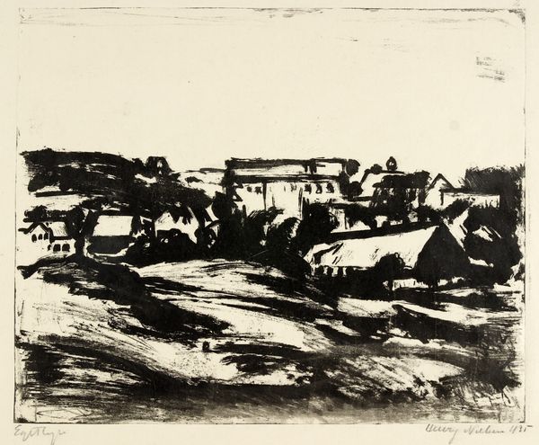 Curator: Welcome. Let’s turn our attention to this etching by Alfred Simonsen, entitled “En landsby,” or "A Village," created sometime between 1930 and 1935. Editor: It strikes me as rather melancholic. The lines are so sparse, almost frantic, capturing a quiet solitude in the landscape. The muted tones enhance that feeling, don't you think? Curator: Absolutely. The sketchy quality of the lines conveys a sense of immediacy. The image contains houses clustered together in a village setting, but there is a sense of rural life slowly fading away. The horizon line seems to be pressing down, creating a sense of enclosure, perhaps symbolizing cultural constriction? Editor: The way the light filters through the hatching is compelling. See how the white of the paper is revealed beneath the inked lines, generating gradations and subtly emphasizing planes of light and shadow on the rooftops and across the fields. Curator: Those formal choices feel tied to the societal shifts of the period. Think of the movement away from rural lifestyles during the early 20th century in the Nordic countries, as urban centers grew. Editor: And even within those sharp, deliberate strokes, there’s a certain tension. There is movement within what might appear to be stable forms. Look at how the hatching diverges over the buildings to represent the details—windows, chimneys, overlapping roofs. It brings an uneasy feeling. Curator: Exactly! It almost evokes the anxiety of change, how industrial growth can swallow smaller communities and force an exodus, an anxiety we may still experience today when contemplating the shifts in technology. Editor: It's more than a quaint cityscape; it’s an expressive study of a specific place at a time, rendered by an artist focused on a formal vocabulary—line, form, shadow. Curator: Thank you for helping us reflect on that. This is an artwork that, even in its simplicity, provokes profound introspection about where we come from, and perhaps, where we are going. Editor: And it also reminds us how critical close observation can be to unlock the layers beneath seemingly straightforward surfaces.