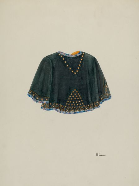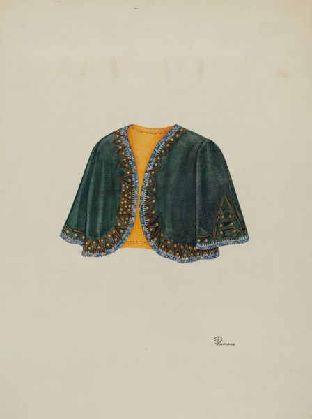 Editor: This is Josephine Romano's "Bolero Jacket" from around 1940, rendered with mixed media and watercolor. It’s incredibly detailed, and it makes me think about luxury and the craft involved in fashion. What stands out to you? Curator: Considering the period, let's think about the materials available, and the labor needed to produce something so embellished. Was this destined for mass production, or a one-off piece? How does the watercolor medium itself – often associated with preparatory sketches – influence our understanding of its "finished" state? Editor: That's interesting, I hadn't considered its production. Could it have been a design prototype perhaps, rather than a piece intended for wear? Curator: Precisely! This could very well be a document relating to industrial or commercial garment production, allowing us to look beyond notions of "high art" to the context of clothing manufacturing. What sort of cultural codes around gender and status might this garment convey if realised? And what does it mean when captured in watercolor and ink? Editor: So it is less about admiring the jacket itself and more about the ideas it represents related to labor and the fashion industry during that time? Curator: Yes, by focusing on the materiality and its potential life as a 'real' object of production we move beyond mere aesthetics. How does this drawing participate in or challenge hierarchies between artistic disciplines and labor at this time? Editor: That perspective really changes my perception of the artwork; it becomes more about the social implications of fashion than just its surface beauty. Curator: Indeed, this 'Bolero Jacket' prompts us to rethink what constitutes art, forcing us to consider artistic choices in dialogue with socio-economic structures. Editor: Thanks for showing me how to see the bigger picture.