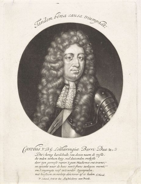 Editor: Here we have François van Bleyswijck's "Portrait of Field Marshal Friedrich Arnaud, Duke of Schomberg," made sometime between 1681 and 1746. It's a print, so quite detailed with fine lines. He seems rather severe, very formal, you know? What do you see in it? Curator: I see a visual representation deeply embedded in power structures and social hierarchies of the time. Consider the Duke: his ornate armor and wig weren't simply fashion statements; they were calculated performances of masculinity and authority. But who had access to such displays, and who was excluded? Editor: So it’s not just about aesthetics but also who got to participate in them? Curator: Precisely. Engravings like these were often commissioned by the elite to solidify their legacy and disseminate their image. Who was the intended audience, and what message was Bleyswijck trying to convey? Think about the way his status is emphasized. Consider its use of line as a means of control—what stories are privileged through the image? Editor: It makes me wonder about the role of the artist, too. Were they complicit in reinforcing those power structures? Curator: Absolutely. Examining art through this lens invites us to question the very narratives embedded within it. Do we have the tools to unpack it? It challenges us to confront how these historical portrayals shape our contemporary understanding of identity, gender, and class. Editor: I guess I hadn't considered that a portrait could be a political statement in itself. It feels like a completely different way to look at art! Curator: Exactly! By engaging with these complexities, we gain a richer understanding of both art and the societies that create it. Hopefully this unveils more than it covers!
