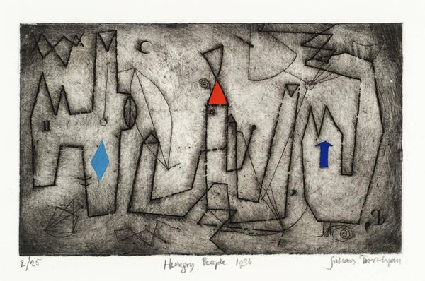 Curator: Julian Trevelyan's etching, Seaside, pulses with a surreal energy, doesn't it? The geometric houses cluster together, like a dreamscape condensed onto a small surface. Editor: It does—almost claustrophobic. The beach is this densely packed field of circles. There is a disquiet to it, perhaps reflecting the unease of 1936, the year it was made. Curator: Perhaps. Or maybe Trevelyan was just playing with how we perceive space. It's tiny, only 178 by 254 millimeters, but manages to convey a whole world. A world seen, perhaps, through a child's kaleidoscope. Editor: It's interesting that the colored diamonds feel almost like coded signals. The red, white and blue echoing a colonial presence, perhaps? Or at least a power dynamic imposed onto the landscape. Curator: I hadn't thought of that. For me, they feel more like little beacons of joy in an otherwise somber scene. It's all in how you look at it, isn't it? Editor: Indeed. I'm intrigued by how it makes us rethink familiar landscapes through the lens of socio-political awareness. Curator: And I love how it reminds us that even the simplest scene can contain a universe of possibilities.