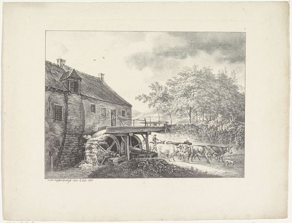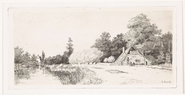 Editor: Gerrit Lamberts’ drawing, "Stairway to the Water," made sometime between 1810 and 1850, shows a simple waterside scene rendered in ink. It's at the Rijksmuseum. The wispy lines give it an almost dreamlike quality, don’t you think? How would you interpret the feeling this work evokes? Curator: Dreamlike is spot on. To me, this drawing whispers of quiet moments, of solitary figures lost in thought, perhaps even a hint of melancholy, reflecting Romanticism’s fascination with nature's power and our emotional response to it. I’m immediately drawn to the solitary figure sitting by the shack, so unassuming. She’s the quiet soul of this landscape. It's more about atmosphere than precision. Do you get a sense of that intimacy, or does something else stand out for you? Editor: I definitely see that solitary mood, and the quick strokes enhance the stillness of the scene, but what's particularly striking is how Lambert manages to capture the light on the water. Curator: Ah, yes! Look how the light dances on the water's surface – a technique that draws us into the tranquility of the scene. Romanticism did adore that luminosity; it gave paintings a sense of the sublime. Lambert is not just depicting a scene; he is giving us the *feeling* of being there, standing on that rickety stairway to another world. What are your final thoughts on this "other world"? Editor: It makes me appreciate how simplicity in art can be so expressive. The details of the shack, figure and staircase come alive! Curator: Exactly! Now if we only had the means to dive into that lake. What a wondrous dive of reflection it would be...