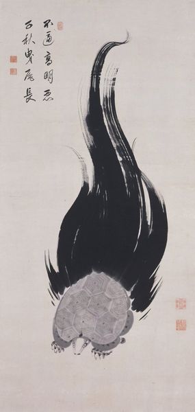 Ito Jakuchu’s ink on paper, painted in 18th century Japan, presents a turtle with an unusually expressive tail, defying naturalism to suggest deeper meanings. The turtle, a symbol of longevity in East Asian cultures, is here infused with a dynamic energy that transcends its typical representation. The flowing tail, almost like a comet’s tail, bears a striking resemblance to depictions of dragons or celestial phenomena found in earlier Chinese art. This echoes the ancient association of turtles with cosmic symbolism, seen in oracle bones where turtle shells were used for divination. The dynamic brushstrokes evoke a sense of vitalism, linking the turtle to broader concepts of life force. The image stirs in us a deep, subconscious recognition of life’s persistent energy, challenging the conventional wisdom. Like a dream, it blends familiar symbols with unexpected twists, urging us to reflect on the interconnectedness of life, longevity, and cosmic energies.