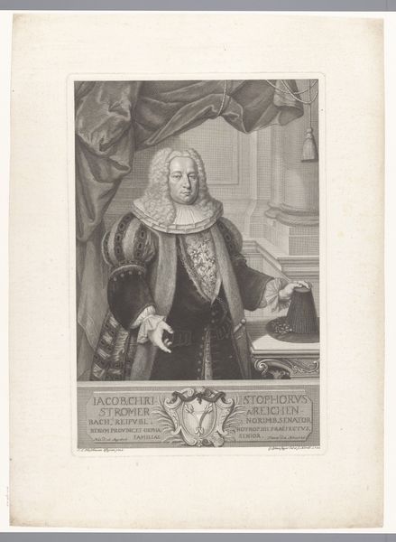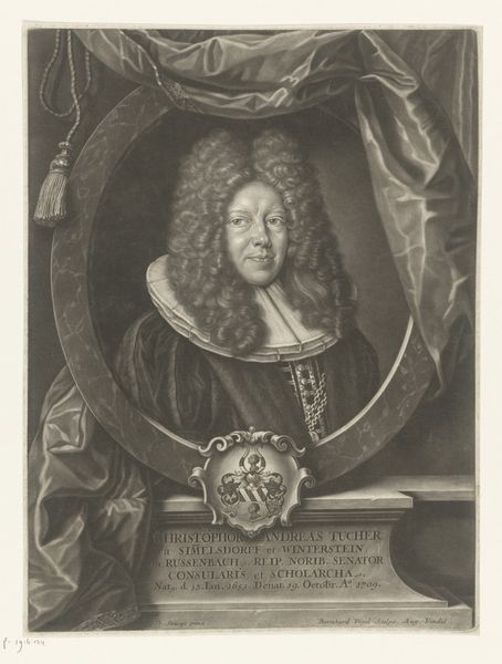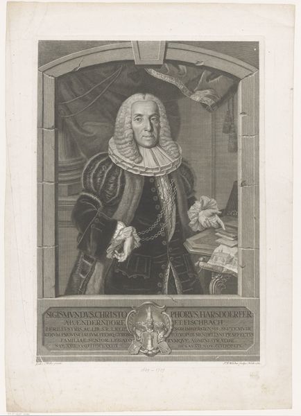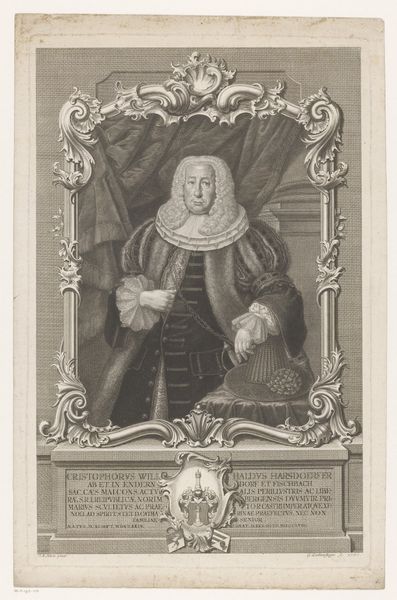 Paul Küfner created this portrait of Christoph Wilhelm Staudner using black chalk and gray wash, employing the chiaroscuro method. Consider the context of 18th-century Europe, a time marked by rigid social hierarchies and emerging Enlightenment ideals. Staudner, a man of law, is depicted with symbols of his status: elaborate wig, ruffled collar, and formal attire, all signaling affluence and authority. Yet, there's a tension in his gaze, a hint of vulnerability perhaps, challenging the stoic representation of power. This portrait prompts us to consider how identity is constructed through visual cues. Staudner's image isn't merely a record of his likeness, it reflects the aspirations and anxieties of a society grappling with shifting notions of class and selfhood. The detailed rendering invites us to contemplate the man behind the title, blurring the lines between public persona and private experience. The portrait serves as a mirror, reflecting both the individual and the societal forces that shaped his world, asking us to reflect on the complexities of power, identity, and representation.