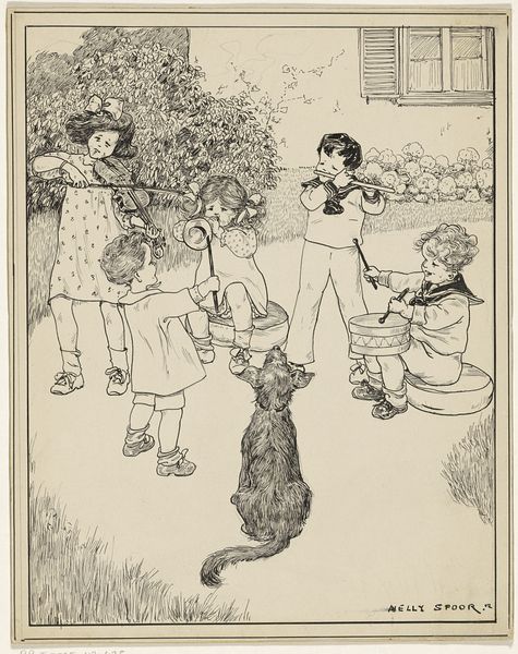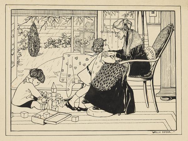 Editor: We're looking at "Spelende kinderen in een interieur," or "Children Playing in an Interior," a 1918 drawing by Nelly Spoor. It feels like stepping into a storybook. The delicate linework gives it such a nostalgic, almost dreamlike quality. What captures your imagination in this piece? Curator: It’s funny you say “storybook,” because that’s exactly where my mind goes. There's a vulnerability in the scene; the window, though bright, reveals bare trees, perhaps suggesting a quiet winter's day. This intimacy is reflected in their concentrated play, as they're completely immersed in their respective worlds – a doll tea party versus a geometric exploration. Editor: The way the light filters through the window really sets the mood. Do you think that was intentional? Curator: Absolutely. Spoor, while maybe not a household name, was clearly attentive to the quiet dramas of domestic life. It's more than just observation; it feels like a gentle invitation to share in a moment of serene childhood. What does the composition tell *you*? Does your eye settle anywhere in particular? Editor: I think I'm drawn to the contrasting activities; one, very imaginative and the other, very constructive! Also, is the window behind the "tea party" dolls suggesting the possibility of their escape to somewhere far away, a space unbound? Curator: Beautifully observed! That interplay keeps the drawing dynamic. What initially appears like a simple scene slowly reveals layers of interpretation. Who knows what journeys they could embark on beyond that winter window? It makes you wonder about the stories these children might be writing, doesn't it? Editor: Absolutely. I appreciate how this work highlights the everyday beauty and potential in ordinary life.