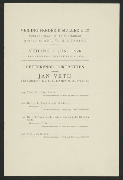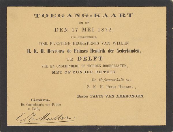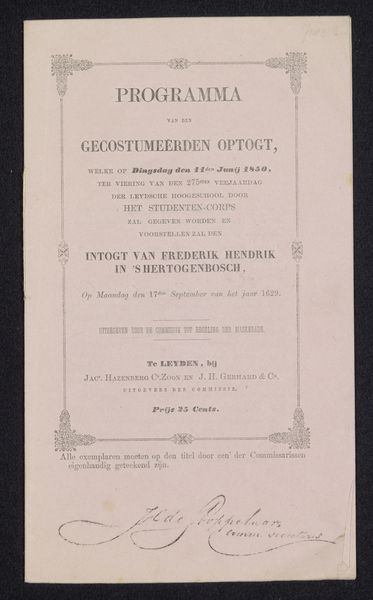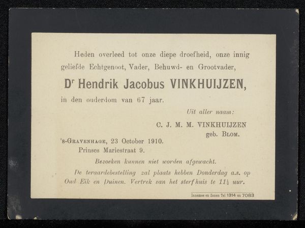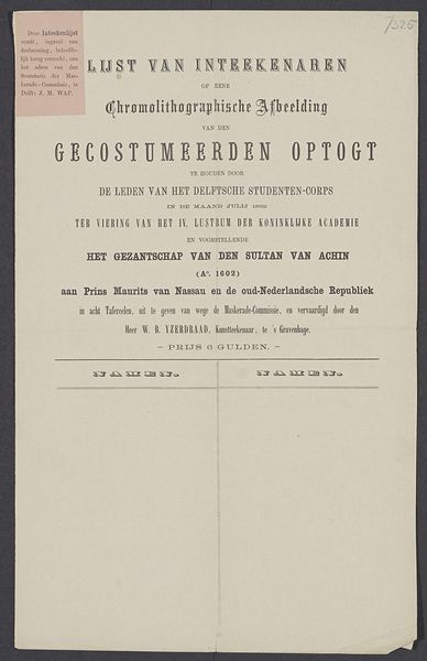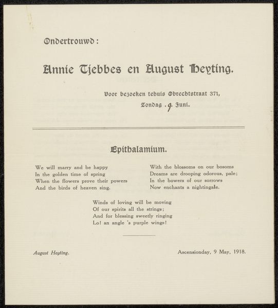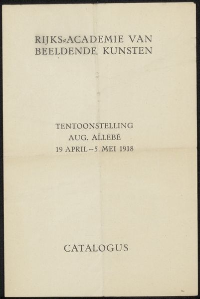 Curator: So, we’re looking at a printed poster, probably from 1918, announcing the Jubilee of Augustus Allebé at the Rijksacademie van Beeldende Kunsten. What's catching your eye? Editor: The immediate vibe is… austere, almost melancholic. I’m imagining a somber ceremony. It’s simple typography, like a telegram announcing bad news but with a slight Art Nouveau twist, particularly that ever so slightly curved line dividing the name. Does that fit the cultural mood, do you think? Curator: Definitely. The shadow of the First World War loomed large. Allebé, though a celebrated figure in the Dutch art world, was nearing the end of his life. This event wasn't just a celebration; it was a recognition of a lifetime's work against a backdrop of national and international anxiety. I think the design reflects a desire for dignified remembrance. Editor: "Dignified remembrance," I like that. The names listed at the bottom—the performers? And "Tekst der gezangen…" Hymns? It reinforces this sense of formal tribute. I wonder what Sem Dresden conducted. Something suitably gravitas-filled, I imagine. Curator: Yes, exactly. Sem Dresden was a very important composer and conductor; the list does indeed mention vocalists and performers for the occasion. And "Tekst der gezangen" suggests a very carefully chosen repertoire designed to honor Allebé's legacy within a specific cultural framework, right? Think about the significance of vocal music at that time, the power of collective voice... Editor: A collective lament, maybe? It makes you wonder about Allebé himself. Was he present? Did he approve the program? This poster becomes this tangible link to a moment where personal artistic achievement intersected with a nation facing enormous change and profound loss. Curator: Precisely. And that tension, between individual achievement and collective experience, is what makes it a really poignant historical artifact, I think. Editor: I'm going to remember this poster—not as a straightforward announcement, but as a quiet whisper from a fractured time, celebrating art in the face of it all. It's sad, really, but there’s resilience humming beneath it all too.