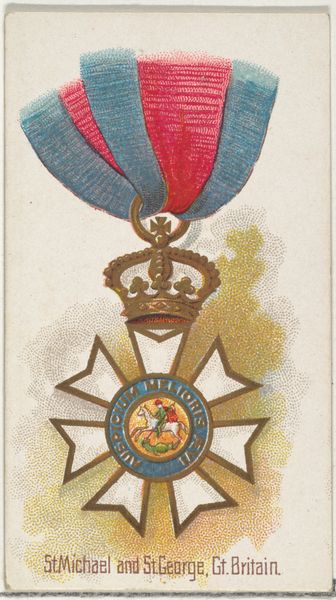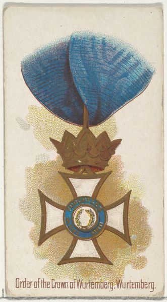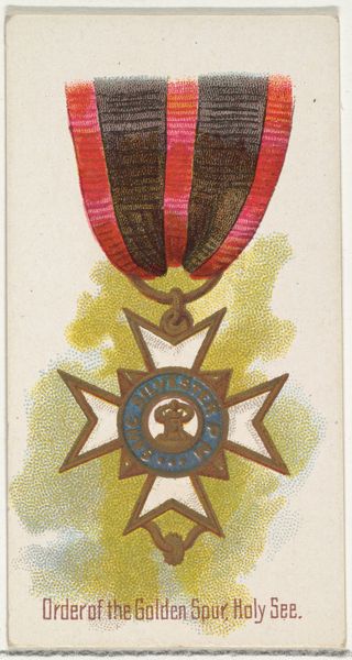 Editor: This chromolithograph from 1890 showcases the Order of the Iron Crown, Austria, from the World’s Decorations series by Allen & Ginter. I’m struck by the level of detail, and I find myself thinking about the symbolism of state power during this era. What do you see when you look at this image? Curator: It is more than a pretty picture; this medal serves as a potent symbol of imperial ideology during a time of immense social upheaval and changing power structures. How was this image circulated, and to what audience? This artwork speaks volumes about the relationship between visual culture, national identity, and the construction of authority. Editor: As part of a cigarette card series, this image would have circulated widely amongst the general public, making the imagery of state power commonplace and perhaps even collectible. It almost seems to normalise it. Curator: Precisely. The normalization is key. Consider how the depiction of this medal reinforces hierarchies and legitimizes Austrian rule at a time when socialist movements and calls for national self-determination were gaining momentum. Think about the implied values: loyalty, duty, and imperial strength. In whose interests are these values promoted? Editor: That really gives me a different way to consider what the artist and publisher hoped to communicate – or reinforce. This image served as propaganda on some level. Curator: It's crucial to consider art objects, even something as seemingly innocuous as a cigarette card, as active participants in shaping social consciousness and power relations. Everything signifies something. How do seemingly decorative pieces shape people’s thinking about belonging? About obedience? Editor: This conversation has revealed to me the image's deeper significance in the context of socio-political power structures of the time, something I wouldn't have considered. Curator: Examining art through the lens of social and historical context helps us reveal its intended impact and broader societal influences. Now, how do these symbolic forms still operate today?
