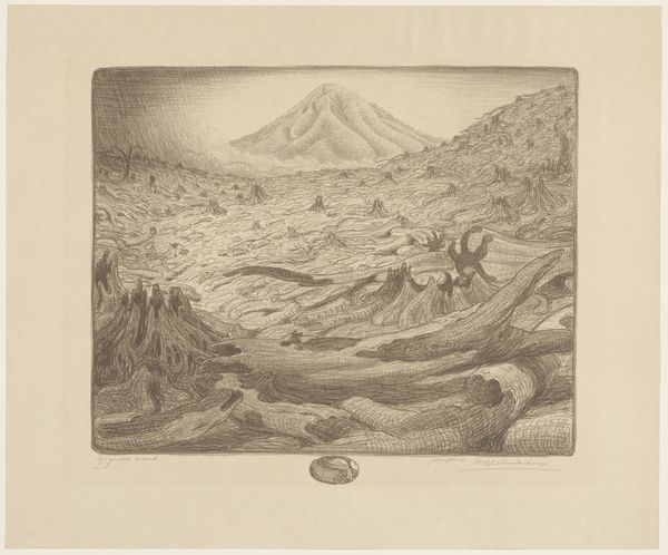 Editor: This is "In het hooggebergte. Idjèn-plateau," a 1918 pencil and print work by Wijnand Otto Jan Nieuwenkamp. It depicts a mountainous landscape with striking textural contrasts, particularly where clouds frame the central mountain. The scene evokes a sense of serene vastness, like a forgotten Eden. What do you make of this piece? Curator: It's interesting to consider this work through the lens of its historical moment. 1918, the end of World War I, a period marked by profound societal upheaval. How do you think the landscape genre, particularly scenes depicting untouched nature, might function in such a context? Was it a form of escape, a yearning for stability, or perhaps even a subtle commentary on the destructive forces of modernization? Editor: That's a perspective I hadn't considered. Maybe the remote setting offered a sense of hope amidst all that destruction, a return to something pure. How might its accessibility influence its societal role? Curator: That’s a key question. While the image portrays a seemingly untouched landscape, the fact that it's reproduced as a print makes it widely accessible to the public. This creates a tension – the image presents a remote ideal, yet it circulates within a modern, increasingly industrialized society. It allows people separated by socio-economic factors to partake in experiencing the serene vista together, promoting access in this tragic, turbulent period. It suggests a democratization of landscape appreciation, wouldn't you say? Editor: Absolutely, democratizing beauty and sparking that sense of wonder sounds invaluable for morale at a crucial point in history. I initially just saw it as a pretty picture but it becomes clear that something deeper is communicated. Thank you. Curator: Indeed. Considering art's public role and the political implications of imagery reshapes our perception. These elements give this work more context, richness, and substance.