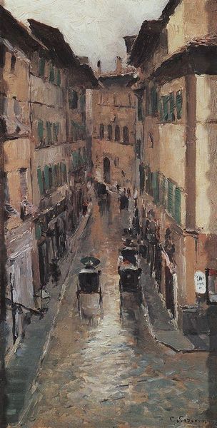 Editor: Here we have Frédéric Houbron’s “La rue Taille-Pain,” painted in 1898 using oil paint. It gives off a slightly melancholic, almost haunted feel to me; like the people are ghosts of Paris past. What strikes you about this piece? Curator: I find this evocative not of ghosts, but of a collective memory etched onto the Parisian cityscape. The architecture itself, rendered in muted tones, speaks volumes. Note how the street, the ‘Taille-Pain,’ translates to 'bread-cutting.' Bread: a visual symbol loaded with a deep resonance to the history, subsistence, life and death for those in French society. Editor: Bread as in, the literal food? Curator: Not just. But the loaded cultural signification surrounding daily life: of community, and shared meals in daily French existence. Notice the people gathered, the very act of sitting at cafes; they, too, become symbols interwoven into the urban tapestry. It's about continuity. What stories do you think these stones and these people whisper to us? Editor: That's fascinating. It really shifts how I see it, moving beyond a simple street scene. It becomes a story, a preserved moment about Parisians and daily sustenance and community. It’s as if Houbron has frozen a transient moment into a lasting symbolic narrative. Curator: Exactly! Houbron captured the ordinary, imbuing it with lasting significance. It’s a beautiful study of the past through a glimpse into daily existence.