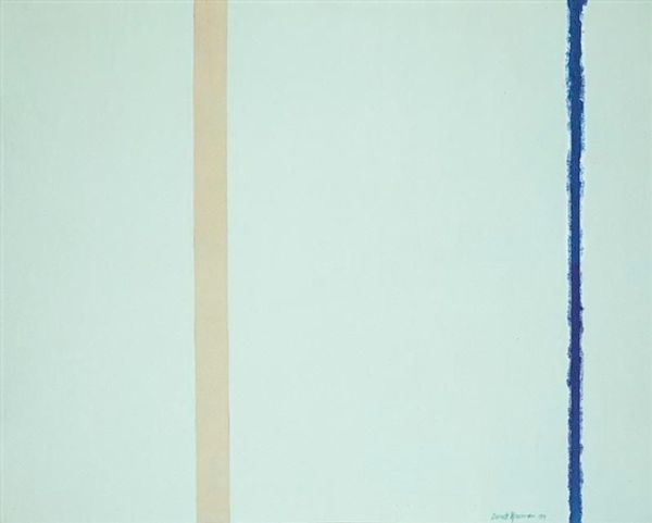 Editor: Jean Degottex’s "Depli bleu (II)" from 1979, an acrylic work, intrigues me. Its simplicity, with minimal blue lines against a large white space, gives me a sense of calm deliberation. What do you see in this piece? Curator: Formally, the painting establishes a visual rhythm using line and plane. The stark contrast between the diluted white field and concentrated blue strokes structures our reading. The composition can be understood as an arrangement of rectangular forms punctuated by the horizontal blue lines. Note how the placement is not arbitrary, each band seems carefully considered. Editor: Yes, the line placements definitely catch my attention! How would you describe Degottex's application of the medium, and why? Curator: The medium's materiality is of vital importance here: The application is rough and immediate; acrylic gives a slightly textured appearance that underscores the deliberate process. In breaking down representational conventions, the materiality itself comes forward. What is emphasized then is gesture, line, and their interplay within pictorial space. Degottex compels a close examination of purely visual components. Editor: I never would have interpreted the line and shape choices that way, thank you! Curator: The process of formal reading in turn emphasizes the intrinsic value of such artistic practice. A fruitful exercise indeed!