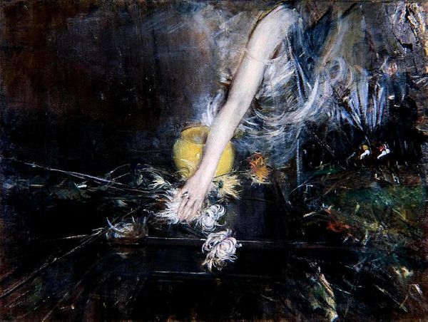 Curator: This untitled work by Zdzislaw Beksinski, created in 1998 with oil and acrylic paint, immediately evokes a sense of haunting isolation. Editor: Yes, there's a pervasive gloom. The subdued palette, primarily blues and grays, and the lone figure wrapped, seemingly, in a shroud, creates a chilling atmosphere. It looks almost post-apocalyptic. Curator: Precisely. Beksinski often explored themes of anxiety and the macabre, particularly in his later works. Notice the figure’s elongated, almost skeletal form, which emphasizes its vulnerability. The composition leads the viewer’s eye directly to the subject, a symbol perhaps of inevitable decay or even social marginalization? Editor: An intriguing interpretation. But consider, too, the neo-expressionistic brushstrokes – quick, gestural, almost violent. Beksinski isn’t just depicting a scene, he's conveying raw emotion. The obscuring of the facial features—are we meant to consider this form stripped of personhood and left only as symbol? The muted color values serve less to highlight form, than to flatten depth and call forward something that might otherwise recede. Curator: You make an excellent point. These techniques resonate strongly with the anxieties and disillusionment following the collapse of communism in Eastern Europe; perhaps his figures reflect that post-ideological void and how societies struggle with transition? This adds another dimension to its reading. The dreamscapes that never materialize as hoped. Editor: Yes. There are multiple dimensions that extend the cultural work to different points in European memory as well. Consider the landscapes of Caspar David Friedrich, where the individual appears similarly before unknowable forces, and similarly composed by strokes of light and depth. Beksinski's style might even resonate with a long lineage of sublime art, prompting viewers to engage in moments of historical reflexivity even as they meet it new. Curator: And yet, despite its unsettling nature, the work possesses an undeniable beauty. There is complexity to the figure that is difficult to read. And the careful manipulation of light brings forward textures, creating a strangely compelling visual experience. Editor: Ultimately, I think Beksinski asks us to confront not only death and decay, but the deeper structures we place on social and cultural life, as well. A bleak reflection, perhaps, but profoundly human. Curator: I agree. The piece speaks powerfully of our own fragility and resilience, making it a deeply unsettling, and therefore powerfully memorable artwork.