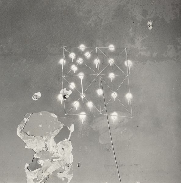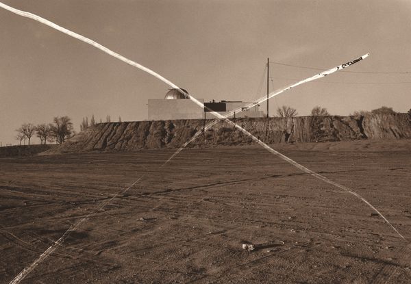 Editor: This is Thomas Barrow’s “H2O Whole Plate” from 1974. It’s a black and white photograph, and it's making me feel a little uneasy. It’s a very stark, almost clinical image, with those strange…holes? Scattered across the sky. What do you see in this piece, considering its place in the art world at the time? Curator: What I find compelling about Barrow’s photograph is precisely that tension it creates. Consider the context of 1970s photography. We’re moving away from purely representational work towards conceptual art using photography as a medium. This piece, with its ambiguous manipulation of the image, directly challenges our understanding of photographic truth. What kind of institutional space do you think of when you view this image? Editor: Well, seeing the fence and the industrial looking building I imagine some sort of test facility or a military complex. Why would Barrow use such a specific unsettling backdrop? Curator: Exactly. Barrow uses this space—this possibly restricted site—as a canvas to explore post-war anxieties, a reflection of our culture grappling with control and technological impact. Those 'holes,' possibly added in the darkroom, disturb the clean surface, suggesting invisible forces at work. Does it strike you that the photo would exist without the artistic intervention? Editor: No, not at all. Now I see the 'holes' aren’t just about defacing the image; they become focal points, inviting us to question the surface and what lies beneath, socially and politically. Thank you for contextualizing it. Curator: Indeed. Thinking about photography not just as a recording device, but a medium for active critique gives us fresh perspectives to examine and contextualize artworks impact through time.