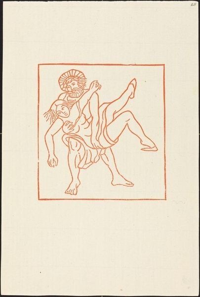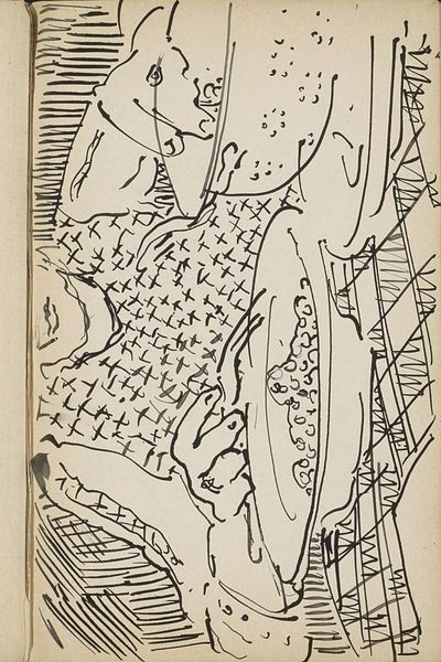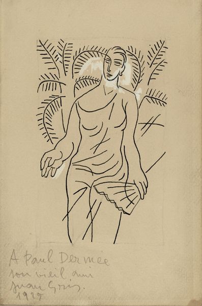 Editor: This drawing, "Erinys" by Ben Nicholson, was created in 1957 using ink. There’s an ethereal quality to the figures; one winged and the other bound. I’m struck by the contrast of freedom and constraint depicted with such simple materials. What can you tell me about the material choices and process behind it? Curator: I think the immediate thing we notice is its sketch-like quality. It doesn’t appear laboured but has likely required immense knowledge and facility to create. The deliberate act of using ink on paper, humble materials associated with sketching and preliminary studies, becomes significant. Nicholson elevates this 'low' method to a final artwork. Why do you think he chooses this process, in contrast to oil paintings for instance? Editor: Perhaps it's the immediacy? Ink allows for a directness, less room for revision compared to painting. I see this linking to the rawness of the mythological subject of punishment and fury. Curator: Precisely. Consider the cultural context. Post-war, artists were experimenting with rejecting traditional notions of "high art" by using simple materials. The ink's accessibility also speaks volumes. Nicholson isn’t concerned with opulent displays, he is showing an engagement with post-war realities, questioning traditional hierarchies within the art world through this focus on material and process. What do you make of the interplay of lines and the effect of layering to show depth? Editor: The overlapping lines almost feel like the figure is struggling, visually conveying a sense of tension and internal conflict through the layering of materials. Curator: Exactly! Nicholson is making us acutely aware of his artistic choices and processes, and his selection and application of modest material has an intriguing symbolic weight. Editor: I see what you mean, focusing on these aspects has helped me better appreciate the social implications of Nicholson's artistic choices.