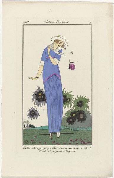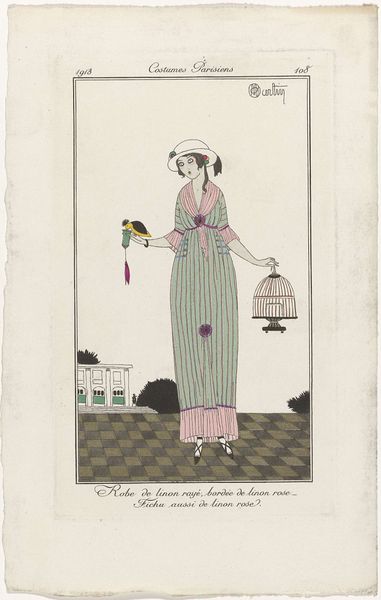 This fashion plate was made by Charles Martin in 1912, using watercolor and perhaps a stencil. The image depicts a stylish woman in a linen dress, accessorized with English embroidery and pearls. What’s interesting here is how the material—linen—conveys social status. Linen production has always been labor-intensive, requiring the cultivation of flax, spinning the fibers into thread, weaving the cloth, and then bleaching it. This made linen desirable for clothing and household textiles. However, by the early 20th century, industrialization made cotton more affordable, but linen retained its cachet as a luxury fabric. This print is, therefore, not just a depiction of fashion but also an advertisement for a lifestyle, one of leisure and refinement. The image emphasizes the dress's delicate embroidery, pearls, and airy texture, alluding to the skill involved in its making. The image prompts us to consider the relationship between fashion, labor, and class in early 20th-century Paris.