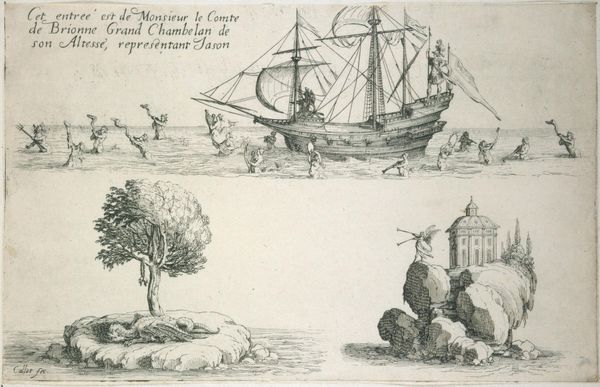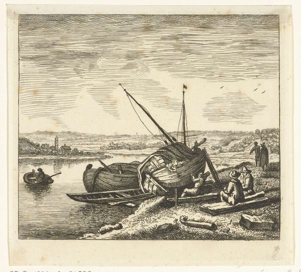 Editor: So, we’re looking at Albert Flamen’s etching, “Ansjovissen bij een mand en visnet,” from 1664, a delightful depiction of anchovies with fishing gear. I find myself drawn to the contrasting activity - a stillness embodied by the heap of fish juxtaposed with the human hustle in the background. What do you make of this busy yet still scene? Curator: It strikes me as a snapshot of a bustling coastal community. Imagine the salt-laced air, the cries of gulls, the rough hands sorting the day's catch! Flamen masterfully captures this sense of place, doesn't he? But it’s more than just a genre scene; notice how the artist gives such careful detail to the fish, creating almost individual portraits. Are they merely produce, or do they hold a different significance for him, for this time period? Editor: That’s a thought. It makes me reconsider their position in the foreground. Curator: Right? These humble anchovies practically jump off the page! Consider how etchings like these were often distributed; think about who may have purchased this print. Was it intended for someone connected to the fishing industry? A simple still life to decorate the home? I wonder. What’s your take on the setting; it seems so active? Editor: The flurry of activity on the shore makes me wonder what was being traded or where the anchovies were being shipped. Curator: Exactly! It makes me ponder trade routes and the economic importance of anchovies to this community. You begin to feel the pulse of 17th-century life in this tiny piece of paper. This ordinary image can suddenly open up a world, can't it? Editor: Absolutely. I was seeing just a simple fish scene. Now I’m seeing an economy! Curator: And that, my friend, is the magic of art. Isn't it glorious?