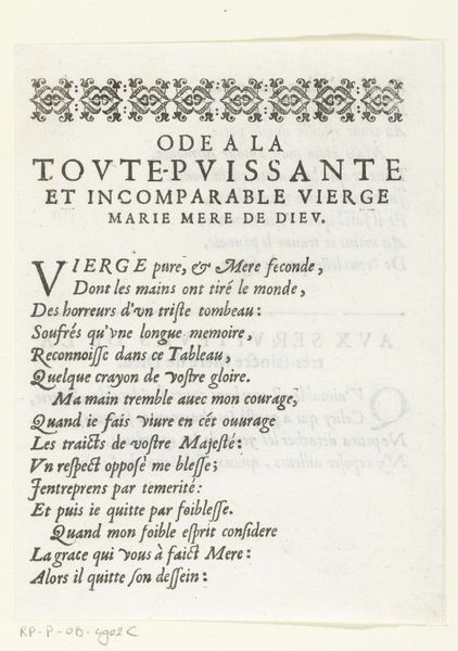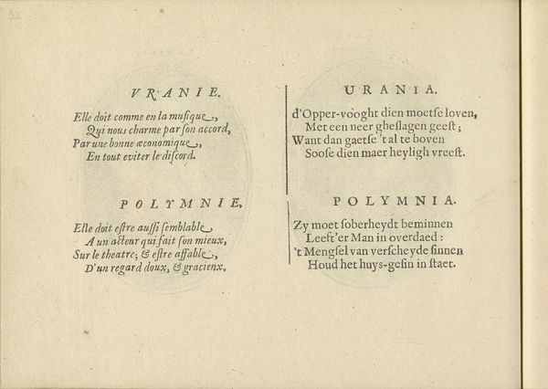 Crispijn van de Passe II created "Kwatrijnen bij de voorstellingen van Mantuana I.M.R. en Galligana R.F." sometime in the 17th century. During this period, there was a growing interest in the representation of women in positions of power, leadership, and influence, often within the context of courtly life and aristocratic society. This print engages with the identities and roles of women through the written word. It likely reflects the historical and cultural context of its time, including prevailing attitudes toward women's roles, expectations, and representations in society. Each quatrain may allude to specific qualities, virtues, or attributes associated with the women being represented. The text weaves together themes of virtue, prudence, and power, portraying the women as figures of authority and influence. The artwork might challenge or subvert traditional gender norms of the time. These poetic texts create an emotional and intellectual experience, inviting viewers to reflect on the complexities of identity and representation in early modern Europe.