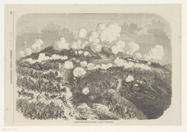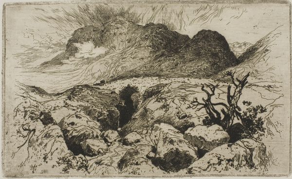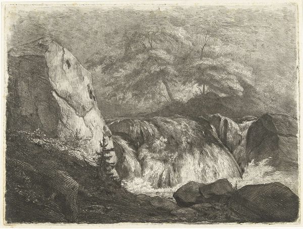 Editor: Here we have "Surtshellir på Island", an engraving by Emanuel Larsen from 1849. It's striking how stark and dramatic the landscape feels, almost otherworldly. What strikes you most when you look at it? Curator: Well, beyond the initial allure of its dramatic light, I find myself pondering what lies beneath the surface, quite literally. This is Romanticism embracing the raw, untamed essence of nature. Notice how the artist uses light not just to illuminate, but to almost *probe* the darkness. Don’t you feel like you’re peering into something ancient? Editor: I do! It feels like looking into a geological past. So, you are thinking about light as symbolic here? Curator: Precisely! Think about what caves represent: the unknown, the subconscious, even death and rebirth. The light becomes a beacon, perhaps symbolizing hope, or knowledge, pushing against that deep unknown. Does the roughness of the engraving itself add to that primal feeling, for you? Editor: Definitely. It’s almost scratchy, emphasizing the ruggedness of the Icelandic landscape, and maybe how harsh life was. It seems this style would perfectly represent a sublime subject in a way that other approaches might obscure? Curator: Absolutely. Larsen’s choice to highlight this volcanic cave becomes a dialogue between the viewer and the formidable power of nature. We confront the monumental. Editor: I hadn't really considered all the layers beneath the surface of the image itself. Now, looking at it, I'm struck by how much it conveys with such stark simplicity. Curator: Isn’t that the joy of discovering art? Sometimes, it’s not just about what’s visible, but about feeling the rumblings beneath.