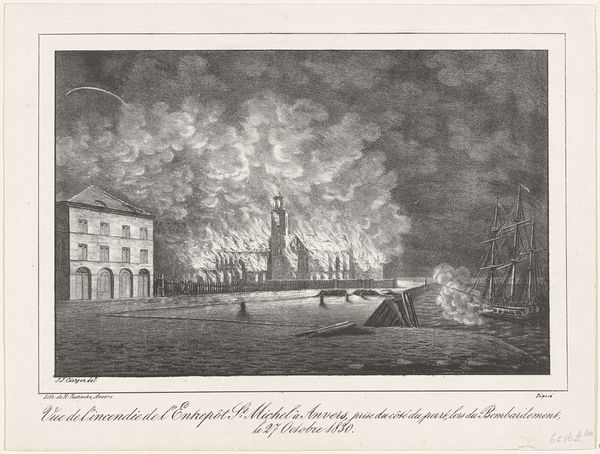 Friedrich Christoph Dietrich created this print depicting the burning of the naval warehouse in Vlissingen in 1809. This is an etching and aquatint, a printmaking process that uses acid to create tonal effects, resembling watercolor. Look closely and you'll see the way Dietrich has used line and tone to create a dramatic scene of destruction. It shows the warehouse ablaze, with smoke billowing into the sky, and people watching from the shore. The use of aquatint gives the print a soft, atmospheric quality that heightens the drama of the event. The medium lends itself to capturing nuances of light and shadow, effectively conveying the chaos and intensity of the scene. Prints like these were relatively cheap to produce at scale, which meant that they could serve as potent forms of social commentary. This image offers insight into the political turmoil of the time and the impact of war on civilian populations. It reminds us that even seemingly simple materials like paper and ink can be used to create powerful statements about society and culture.