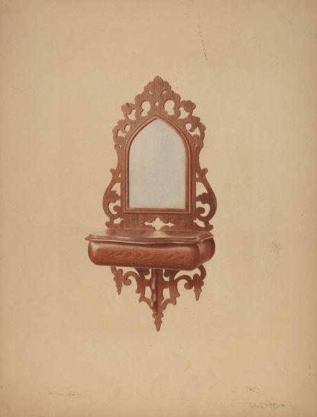 Chris Makrenos rendered this comb box, sometime between 1855 and 1995, with an eye for symbolic form. The most striking is the arch at the top, a shape that has echoed through centuries. The arch, reminiscent of Gothic cathedrals, speaks of transcendence and aspiration. We can trace its lineage back to ancient Roman architecture, where it symbolized power and dominion. Yet, here, on a humble comb box, it suggests something more intimate: a daily ritual framed by echoes of grander, almost sacred spaces. The mirror itself, framed within this arch, becomes a focal point for self-reflection, a moment of introspection. Consider how the act of gazing into a mirror is fraught with psychological weight, a confrontation with the self. This comb box, therefore, isn't merely a piece of furniture but a stage for the drama of self-perception. This daily ritual transforms a mundane object into a powerful cultural artifact, resonating with our deepest desires for beauty, order, and self-knowledge. The arch and the mirror combined invite us to consider how the past shapes our present, reminding us that even the simplest objects can carry profound cultural and personal significance.