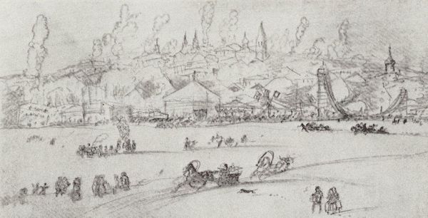 Vasily Polenov sketched "Bridge on the River Cuprija in Paracin" using graphite pencil to capture a fleeting moment in time. The drawing is anchored by the horizontal thrust of the bridge, a dark, rigid form bisecting the scene, contrasting with the lively activity it spans. Polenov organizes the composition in a way that draws our attention to the movement around the river, using delicate strokes to render figures and animals. The texture is achieved through varying the density and direction of the lines. Close examination reveals an order which conveys depth and light, creating not just a picture, but a layered narrative about place and passage. The bridge serves as a structural metaphor, connecting disparate elements while the artist invites us to consider the subtle interplay of light and shadow. Through this Polenov opens up new ways of seeing the world around us.