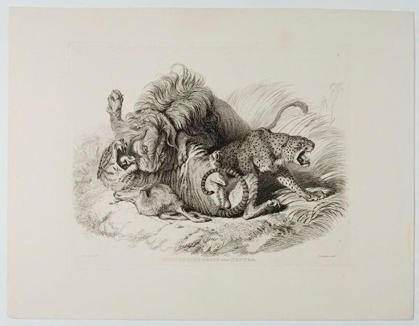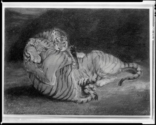 Curator: Here we have Charles-Michel Geoffroy's "The Tiger of Jungles," currently housed in the Harvard Art Museums. Editor: Whoa, that tiger is giving me the chills! It looks like it's about to pounce—the tension is palpable. Curator: Indeed. Note how Geoffroy uses the surrounding foliage to frame the tiger, heightening the sense of enclosure and impending threat. This work is a window into how the exotic was perceived and presented to European audiences. Editor: It's fascinating how the artist captured the raw power of the tiger, but also this undercurrent of fear. Makes you wonder what narratives it evokes about civilization and the untamed wild. Curator: Precisely. It also subtly reflects how the European powers perceived and portrayed colonized lands. Editor: Hmm, I guess there's more here than meets the eye. I see your point, the image is powerful, and there's a story.