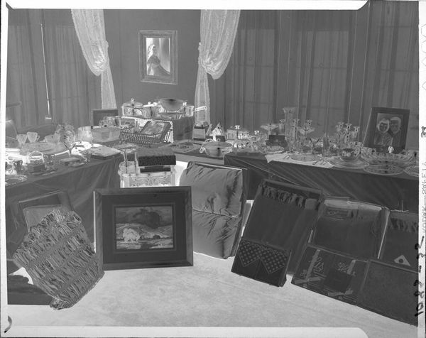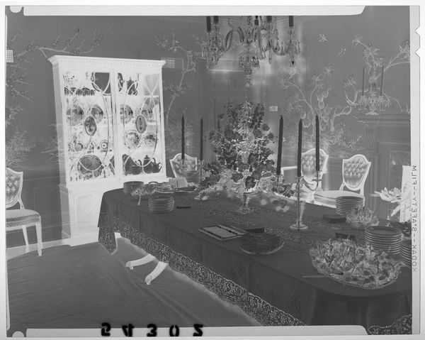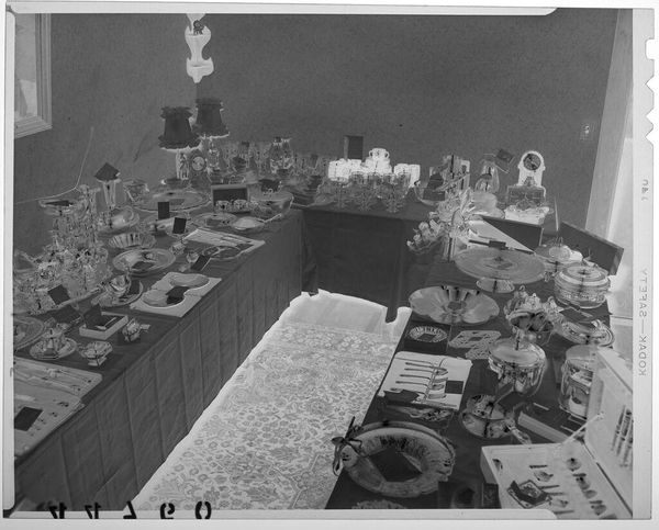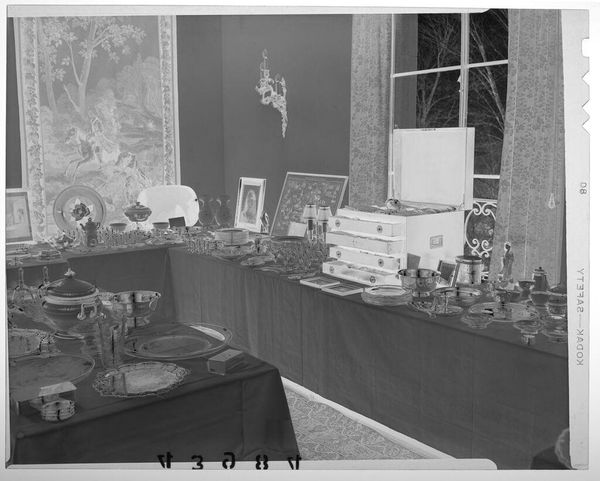 Curator: This photograph by Martin Schweig, labeled "Untitled," captures two tables laden with wedding gifts. There's an almost spectral quality to it. Editor: Yes, it feels like a ghost of a wedding past, all those shimmering silver and china objects. It certainly highlights the material excess often associated with weddings. Curator: The objects themselves are fascinating. Each piece, from the delicate glassware to the framed portraits, carries symbolic weight, representing tradition, prosperity, and family legacy. Editor: And what about the labor involved in producing all these items? The mining of the silver, the glassblowing, the craftsmanship—it all speaks to a complex network of production and consumption. Curator: Indeed. And within this composition, I see echoes of Dutch still-life paintings, referencing themes of abundance and the fleeting nature of material possessions. It's all quite loaded. Editor: Absolutely, it's more than just a record of wedding gifts. It’s a study of value, both material and symbolic, frozen in a single frame. Curator: A fitting testament, in a way, to the enduring power of objects to tell stories. Editor: Ultimately revealing how consumerism intersects with rituals of love and commitment.