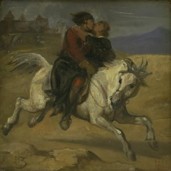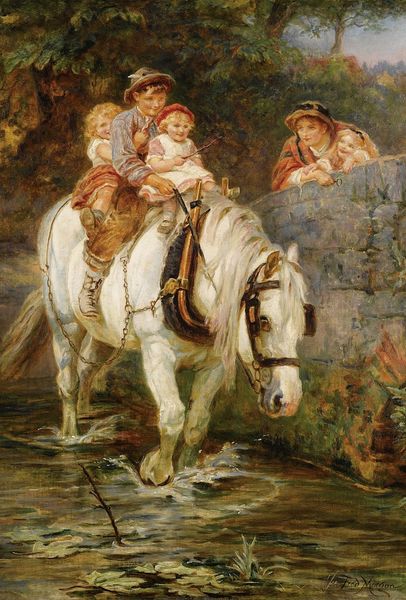 Curator: Here we have Annie Louisa Swynnerton's "Miss Elizabeth Williamson on a Pony," held in the Tate Collections. The oil on canvas measures approximately 168 by 131 centimeters. Editor: The first thing that strikes me is the dreamy, almost windswept quality of it all. There’s a real sense of movement, of a moment captured in time. Curator: Indeed, the composition guides the eye in a distinct upward motion, from the darker, earthy tones at the bottom, to the lighter, atmospheric clouds above. Editor: And there's something about the girl's direct gaze that feels both innocent and knowing. Like she's in on a secret adventure, just between her and that pony. Curator: The brushwork, particularly in the rendering of the pony, is quite expressive. One can almost feel the texture of the animal's coat. Editor: It’s a study of childhood, of freedom, and of a bond between a girl and her steed. I'm left with a sense of lightness, but also a touch of melancholy. Curator: A fitting reflection given Swynnerton's exploration of form and emotion. Editor: Exactly. It's a painting that seems to whisper secrets to those willing to listen.