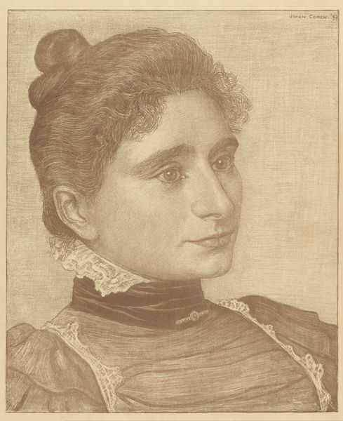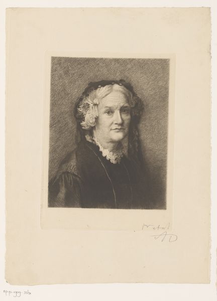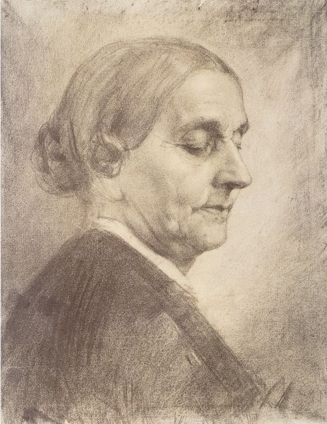 Editor: Here we have Otto Scholderer’s "Bildnis einer älteren Dame nach rechts," a portrait of an older woman. The medium looks like primarily pencil and chalk. I’m struck by the sheer volume of hatching used to render her clothes – it seems almost obsessive. What do you make of the way he’s worked with these simple materials? Curator: It’s compelling, isn't it? This drawing brings into focus the means of its own production. Look at how the labor is laid bare through the sheer density of those pencil strokes. The clothing isn't simply represented; it's built through a repetitive, almost industrial process. What does that level of detail signify, beyond mere representation? Editor: Maybe it emphasizes the materiality of her clothes, her social standing? Curator: Exactly. The lace collar, too, stands in stark contrast to the more roughly sketched areas. Consider the social context: who was commissioning portraits at this time, and what did such a depiction, prioritizing laborious detail, convey about both the sitter and the artist's approach to their craft? Think about the materials themselves – the ready availability of pencil and chalk versus, say, oil paints. Editor: So, it is perhaps an intentional choice of materials that speaks to the democratisation of art-making, using accessible resources to give us this picture? Curator: Precisely! It pushes us to think about the materials, the means of production, and what that means for Scholderer, the subject and, perhaps, even us as viewers today. The focus on the “how” opens a window onto the society of the time. What will you be thinking about differently after examining this drawing? Editor: Definitely how the process of making the artwork is just as important, if not more, than the finished image itself. Curator: A wonderful takeaway! I think it emphasizes the social dimensions that surround its making.
