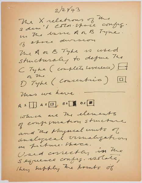 Curator: Stuart Davis, best known for his jazzy, abstract paintings, also produced theoretical writings. This work, "Art Theory Text with Types A and B Configuration Diagrams," is dated March 22, 1943. Editor: Immediately, the handwritten text gives this piece a very personal feel. It seems less like a formal theory and more like a set of notes jotted down in the heat of the moment. Curator: It's fascinating to see Davis grapple with concepts like "configuration isolates." He defines them as a series of colors in positional relationship. We can think about what impact these considerations must have had on the material execution of his painting practice. Editor: And there's a material element here, too. The writing, the paper... What kind of labor went into producing art theory? And how was that labor valued? Curator: Precisely. His diagrams of A and B configurations, even in their simplicity, reveal an attempt to codify and understand the underlying structure of his visual language. How fascinating to see him explore these ideas on paper. Editor: Thinking about the time, 1943, during the height of World War II, I wonder how these "configuration isolates" offered a form of personal or artistic stability amidst global turmoil. Curator: A compelling thought! It gives this seemingly academic exercise a deeper human resonance. Editor: Indeed.