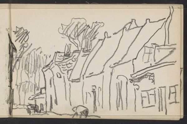 Curator: Alexander Shilling's drawing, tentatively dated between 1913 and 1917, entitled "Boerderijen," offers us a glimpse into rural landscapes through a seemingly simple sketch. Editor: It certainly does. My immediate reaction is a feeling of starkness. The skeletal lines give it a rather raw and perhaps even lonely feel. Is this intentional or merely a byproduct of the artistic choice to create a pen sketch? Curator: From a formal perspective, the lines are quite economical, conveying volume and texture with minimal strokes. Consider how the varying density of the lines helps distinguish the thatched roofs from the more solid walls. There is an elegance in that reduction, which hints towards the formal aspects of Impressionism, yet not completely driven by visual impressions. Editor: But what does it tell us about rural life at the time? It's fascinating to see how this simplicity becomes loaded with historical context. A drawing such as this challenges Romantic ideals of rural life with almost crude lines—it doesn't seem particularly idealized or embellished, almost documentary in its lack of frills. How do you read this from a stylistic perspective? Curator: Precisely, consider its engagement with the essence of form over faithful representation. Shilling’s strategic marks direct our gaze to crucial structural details—the angle of a roof, the position of a window—without being bogged down by surface ornamentation, offering something beyond simple representation. There seems to be an effort to capture light itself by using specific angles. Editor: It almost makes the artwork seem indifferent. It prompts questions regarding Shilling's intentions and how social currents might have directed or informed his artistic vision at that point in history, given that he drew these between 1913 and 1917 during very turbulent years in Europe. It is perhaps not only a depiction of architecture but a commentary on the times. Curator: I appreciate your take. Viewing this piece has revealed to me the inherent expressive capacity found in simplicity; form dictates interpretation beyond simple lines. Editor: And to me, that simple form has unveiled a window into a complicated period of societal upheaval, captured with an arresting candidness.