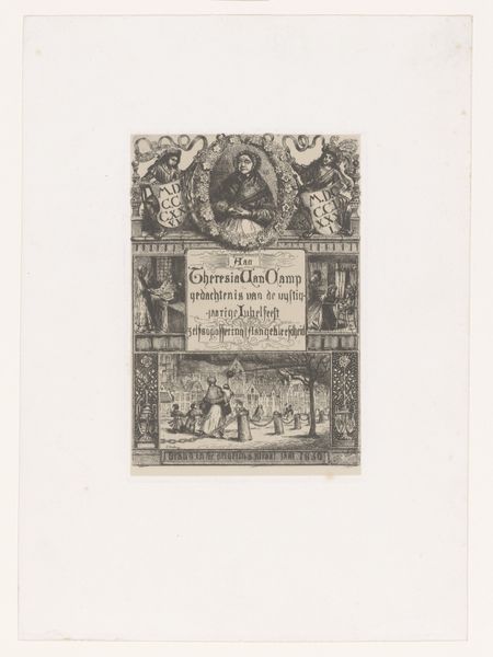 Editor: This is an engraving from 1869, "Diverse Illustrations from the Life of Tijl Uilenspiegel, Around a Portrait of Uilenspiegel," by Alfred Hubert. The scene is just incredibly dense. How would you approach understanding a piece like this, that clearly references historical narratives? Curator: Well, looking at this image, I see a distinct connection to the cultural revival of folk tales and national identity in 19th-century Europe. Consider the subject: Till Eulenspiegel. This trickster figure was enjoying renewed popularity, representing a kind of resistance against authority. Notice how Hubert surrounds the central portrait with vignettes. What do those scenes suggest to you? Editor: I see a lot of playful chaos – almost rebellious moments, figures caught mid-action. Does this reflect a particular political sentiment of the time? Curator: Precisely. The artist, and likely the intended audience, saw in Eulenspiegel a reflection of their own aspirations for autonomy, especially within the context of burgeoning nation-states and social change. These images offered a romanticised vision of social rebellion and popular culture that challenged dominant societal norms. Do you notice anything about how the figures are portrayed in terms of class or social standing? Editor: It's interesting, because they seem to be common folk engaged in everyday activities, elevated almost to the status of myth through the print medium. Curator: Exactly. Print culture played a vital role in democratizing imagery and disseminating these narratives, making art accessible to a wider audience and influencing public perception. Think about the role these prints played in shaping a shared cultural identity. Editor: That's a fascinating perspective. I always think of engravings as just being illustrative, but I see how they also were crucial to shaping ideas about national identity and even political dissent! Curator: Indeed, considering art in this way opens a wider understanding of social and political change. This helps me reflect on art's role as an influencer of history.