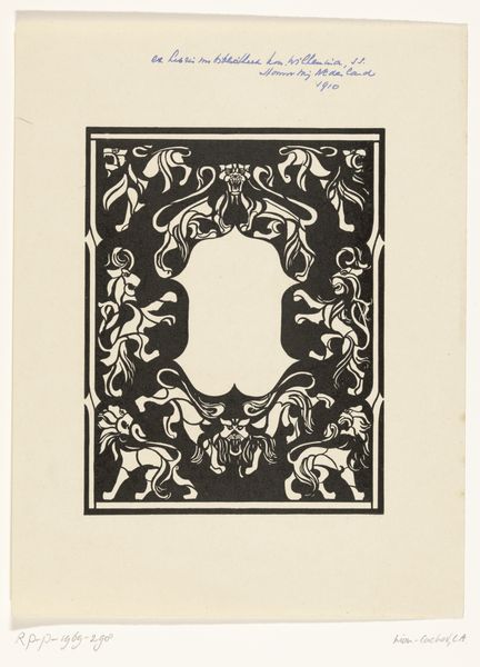 Carel Adolph Lion Cachet created this print, called ‘Siermotief’ or Decorative Motif, at an unknown date, using an unspecified printing technique. Its stylized symmetry evokes the Art Nouveau movement, but also speaks to the specific conditions of artistic production in the Netherlands at the turn of the century. The image creates meaning through the visual codes of the decorative arts, where the aim isn't necessarily to represent the external world, but to establish aesthetic value for its own sake. In the Netherlands at this time, there were strong debates between proponents of pure, autonomous art and those who believed art should serve a social function. Many artists attempted to reconcile these competing values. Cachet’s print is an example of how artists sought to make art a part of everyday life, contributing to a sense of national identity and cultural refinement. Catalogues, archives and design history can help us understand the social and institutional contexts that shaped Cachet’s artistic practice. These illuminate the complex relationships between artistic expression and the broader cultural landscape.